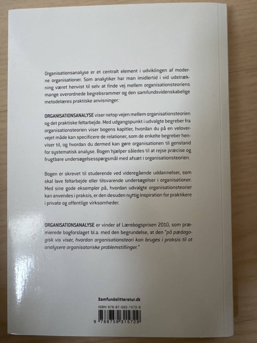 Denne bog er et værdifuldt redskab for studerende, der skal udføre feltarbejde eller undersøgelser i organisationer. Med praktiske eksempler på, hvordan organisationsteori kan omsættes til virkeligheden, giver bogen et solidt fundament for at forstå både private og offentlige organisationers komplekse strukturer og problemstillinger. Organisationsanalyse byder på teoretiske og praktiske perspektiver, der inspirerer både studerende og praktikere. Med 222 sider formår Christian Frankel at belyse, hvordan en målrettet analyse kan frembringe ny indsigt i organisatoriske processer og udfordringer. Bogen, udgivet i 2011 af Samfundslitteratur, er et oplagt valg for dem, der ønsker en dybdegående forståelse af organisationsteori i praksis.