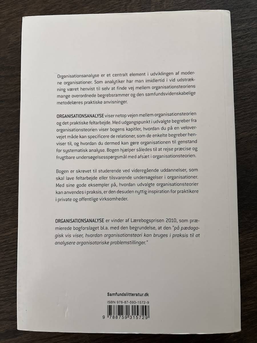 Denne bog er et værdifuldt redskab for studerende, der skal udføre feltarbejde eller undersøgelser i organisationer. Med praktiske eksempler på, hvordan organisationsteori kan omsættes til virkeligheden, giver bogen et solidt fundament for at forstå både private og offentlige organisationers komplekse strukturer og problemstillinger. Organisationsanalyse byder på teoretiske og praktiske perspektiver, der inspirerer både studerende og praktikere. Med 222 sider formår Christian Frankel at belyse, hvordan en målrettet analyse kan frembringe ny indsigt i organisatoriske processer og udfordringer. Bogen, udgivet i 2011 af Samfundslitteratur, er et oplagt valg for dem, der ønsker en dybdegående forståelse af organisationsteori i praksis.