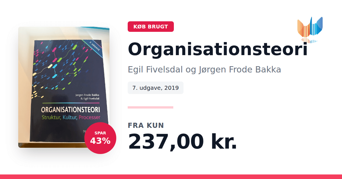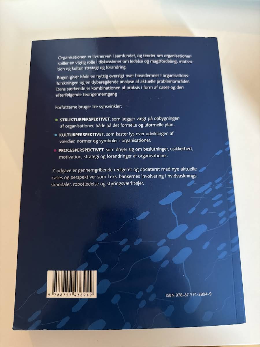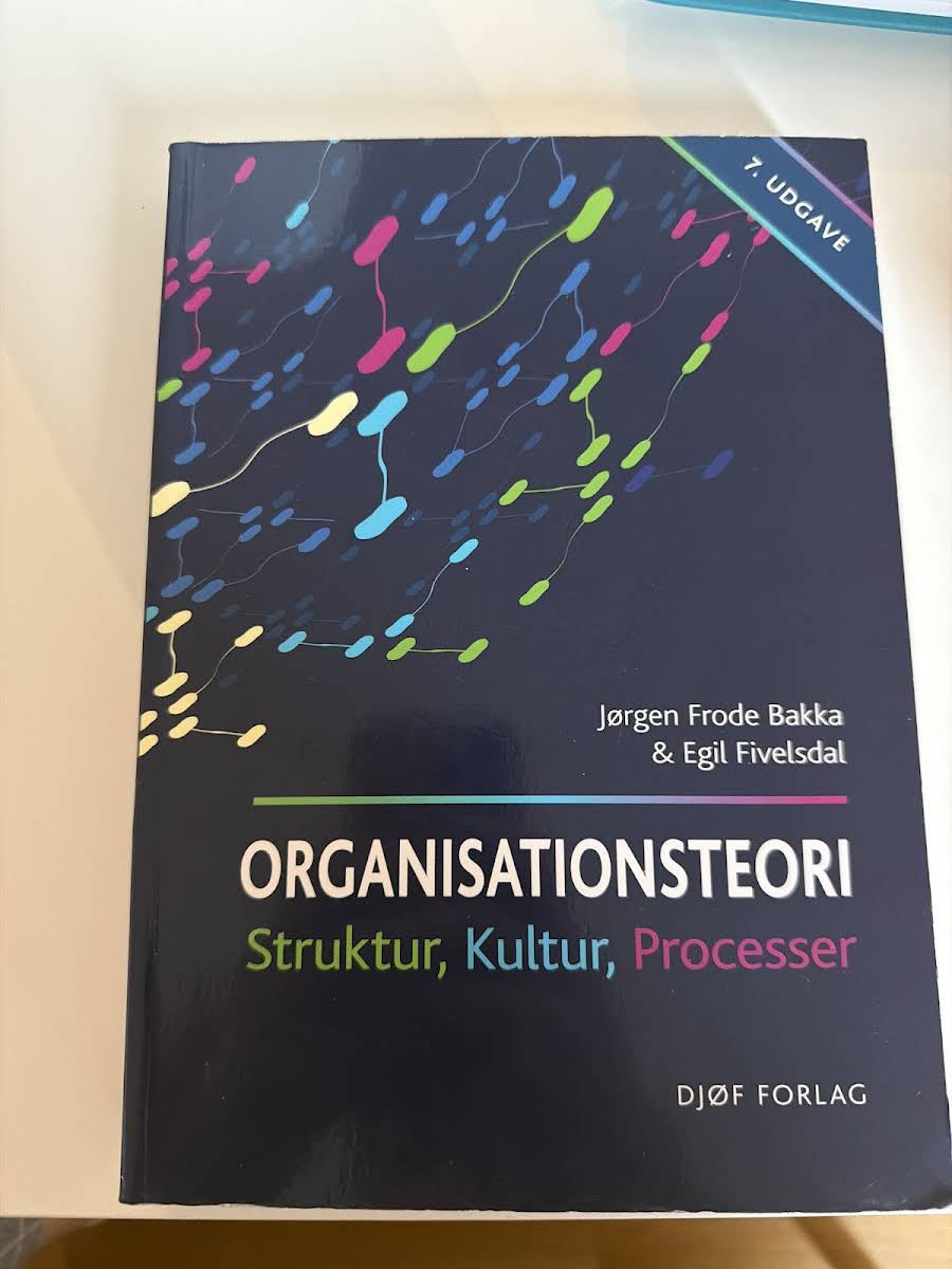 "Organisationsteori" fra 2019 af Egil Fivelsdal og Jørgen Frode Bakka tilbyder en grundig introduktion til centrale emner inden for organisationsforskning. Bogen undersøger, hvordan organisationens struktur, kultur og processer interagerer, og illustrerer teorierne gennem konkrete cases, som sætter fokus på både individet og organisationens samlede opbygning. Med udgangspunkt i cases fra den praktiske verden kombineres teoretiske perspektiver med virkelighedsnære eksempler, der belyser ledelse, strategi og forandringsprocesser. Denne opdaterede udgave giver læseren et solidt fundament for at forstå de dynamiske processer, der spiller en afgørende rolle i nutidens organisationer.