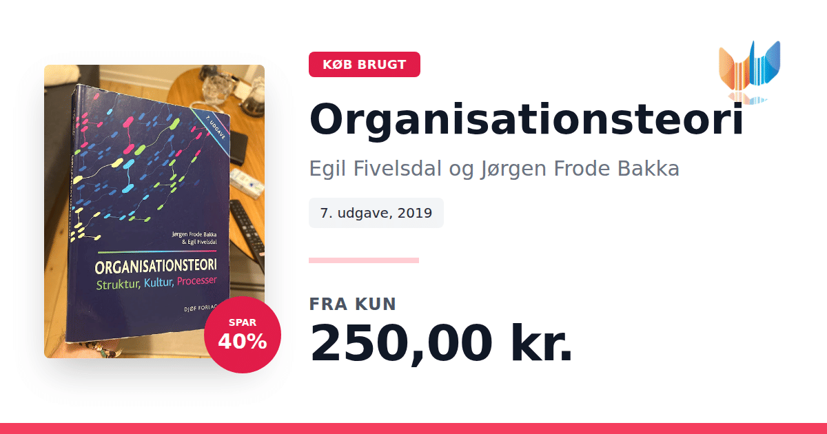 "Organisationsteori" fra 2019 af Egil Fivelsdal og Jørgen Frode Bakka tilbyder en grundig introduktion til centrale emner inden for organisationsforskning. Bogen undersøger, hvordan organisationens struktur, kultur og processer interagerer, og illustrerer teorierne gennem konkrete cases, som sætter fokus på både individet og organisationens samlede opbygning. Med udgangspunkt i cases fra den praktiske verden kombineres teoretiske perspektiver med virkelighedsnære eksempler, der belyser ledelse, strategi og forandringsprocesser. Denne opdaterede udgave giver læseren et solidt fundament for at forstå de dynamiske processer, der spiller en afgørende rolle i nutidens organisationer.