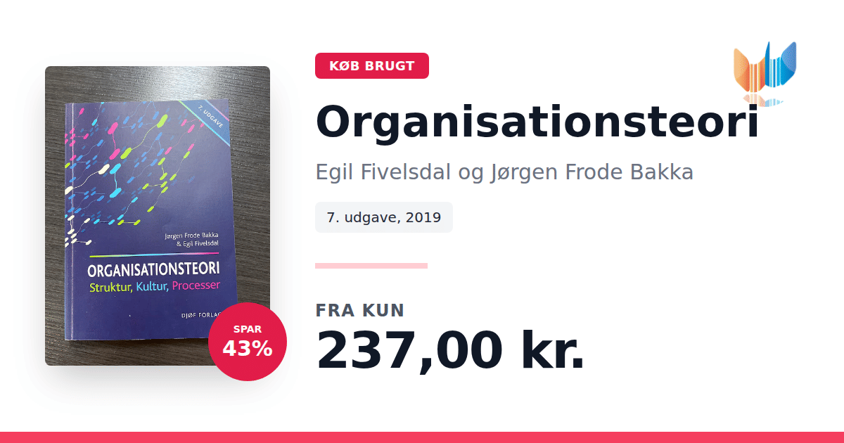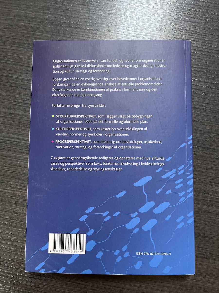 "Organisationsteori" fra 2019 af Egil Fivelsdal og Jørgen Frode Bakka tilbyder en grundig introduktion til centrale emner inden for organisationsforskning. Bogen undersøger, hvordan organisationens struktur, kultur og processer interagerer, og illustrerer teorierne gennem konkrete cases, som sætter fokus på både individet og organisationens samlede opbygning. Med udgangspunkt i cases fra den praktiske verden kombineres teoretiske perspektiver med virkelighedsnære eksempler, der belyser ledelse, strategi og forandringsprocesser. Denne opdaterede udgave giver læseren et solidt fundament for at forstå de dynamiske processer, der spiller en afgørende rolle i nutidens organisationer.