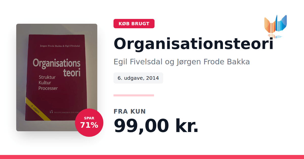 Organisationsteori: Struktur, kultur, processer af Jørgen Frode Bakka og Egil Fivelsdal giver en alsidig introduktion til, hvordan organisationer opbygges og udvikles. Bogen kombinerer en grundlæggende oversigt med dybdegående analyser af centrale områder inden for organisationsforskningen, og læseren præsenteres for, hvordan struktur, kultur og processer spiller sammen og påvirker ledelse, beslutninger og forandring. Forfatterne benytter tre perspektiver for at belyse organisationens virkelighed: strukturperspektivet, som fokuserer på både formelle og uformelle elementer; kulturperspektivet, der undersøger, hvordan værdier, normer og symboler skaber identitet; og procesperspektivet, som ser nærmere på beslutningsprocesser, usikkerhed og strategiske udfordringer. Med skarpe analyser og konkrete cases illustrerer bogen, hvordan teori og praksis mødes i organisationsverdenen. Denne sjette udgave videreudvikler og opdaterer de teoretiske indsigter, så den både tjener som et praktisk redskab og som en inspirerende refleksion over organisationers rolle i samfundet.