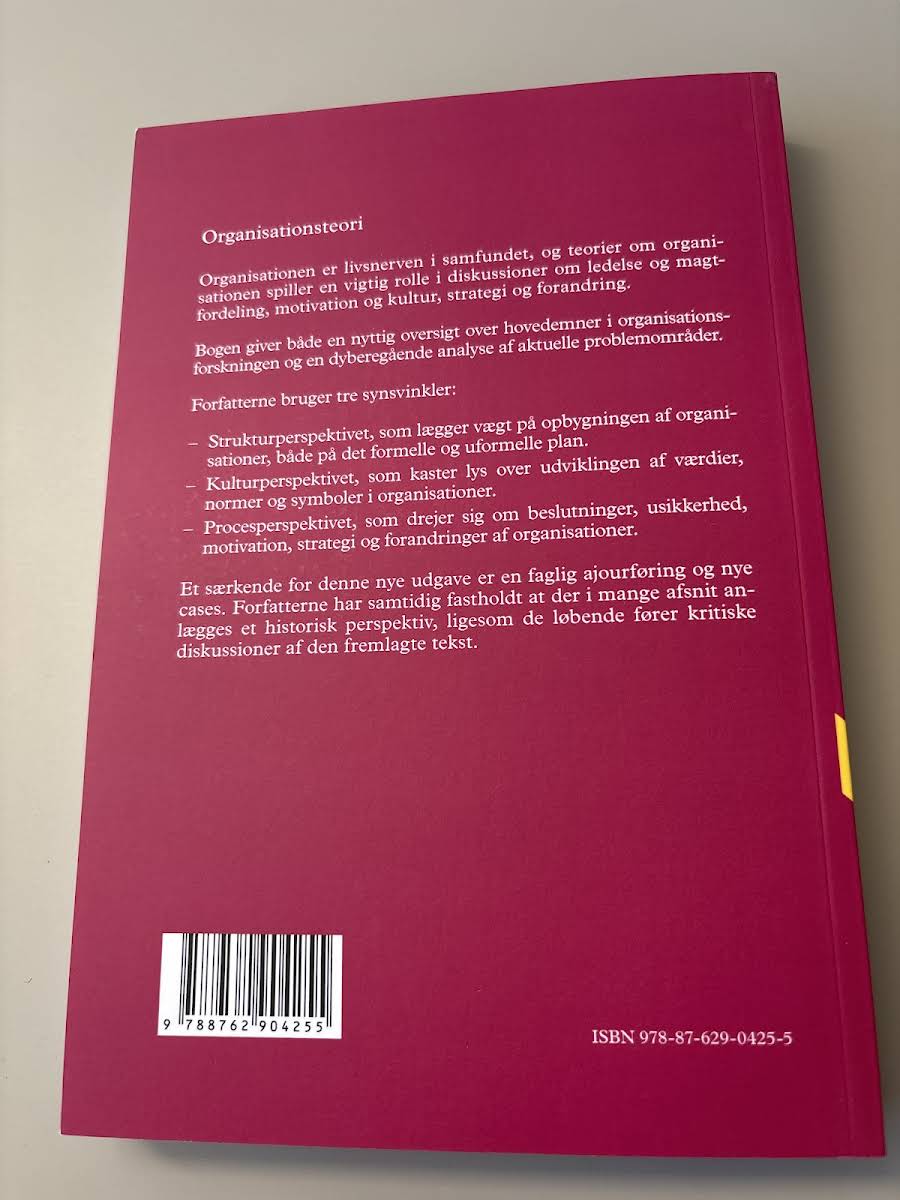 Organisationsteori: Struktur, kultur, processer af Jørgen Frode Bakka og Egil Fivelsdal giver en alsidig introduktion til, hvordan organisationer opbygges og udvikles. Bogen kombinerer en grundlæggende oversigt med dybdegående analyser af centrale områder inden for organisationsforskningen, og læseren præsenteres for, hvordan struktur, kultur og processer spiller sammen og påvirker ledelse, beslutninger og forandring. Forfatterne benytter tre perspektiver for at belyse organisationens virkelighed: strukturperspektivet, som fokuserer på både formelle og uformelle elementer; kulturperspektivet, der undersøger, hvordan værdier, normer og symboler skaber identitet; og procesperspektivet, som ser nærmere på beslutningsprocesser, usikkerhed og strategiske udfordringer. Med skarpe analyser og konkrete cases illustrerer bogen, hvordan teori og praksis mødes i organisationsverdenen. Denne sjette udgave videreudvikler og opdaterer de teoretiske indsigter, så den både tjener som et praktisk redskab og som en inspirerende refleksion over organisationers rolle i samfundet.