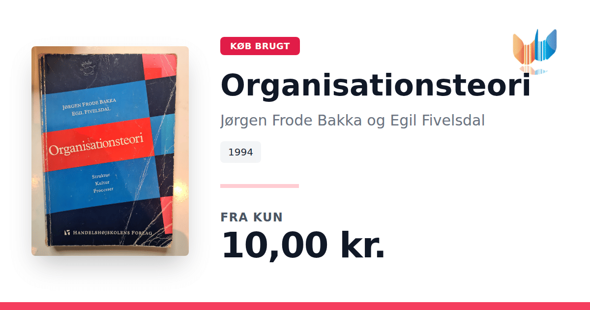 Lige nu kan du købe "Organisationsteori" af Jørgen Frode Bakka og Egil Fivelsdal til kun 10,00 kr. Bogen du ser her er brugt, og i slidt stand. Vi har i øjeblikket 18 eksemplarer til salg af "Organisationsteori", så husk at se de forskellige udgaver.
