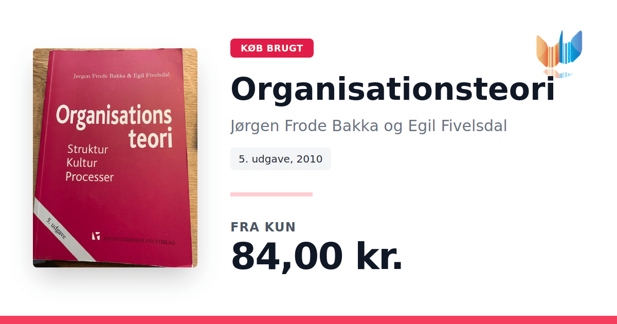 Organisationsteori: Struktur, Kultur, Processer af Jørgen Frode Bakka (2010) giver et systematisk overblik over de teorier og begreber, der former måden, vi forstår og organiserer arbejde på i både private og offentlige organisationer. Bogen henvender sig til studerende og ledere, der ønsker at kombinere teoretisk indsigt med konkrete eksempler fra praksis. Ud fra tre analytiske vinkler - strukturperspektivet, kulturperspektivet og procesperspektivet - belyses organisationers opbygning, deres værdier og symbolske univers samt de dynamikker, der knytter sig til beslutninger, motivation og forandring. Strukturperspektivet kortlægger både formelle roller og informelle netværk. Kulturperspektivet viser, hvordan normer og historier skaber sammenhængskraft. Procesperspektivet sætter fokus på strategiske valg, usikkerhedshåndtering og implementering af nye initiativer. I bogen præsenteres en række illustrative cases fra danske organisationer: Gamle Carlsberg, Falcks Redningskorps, Coloplast, IKEA, IRMA, Oticon, Amager Hospital, Hørsholm Kommune og andre. Hver case udfolder, hvordan teorierne anvendes i praksis, og skaber en direkte kobling mellem akademisk forskning og daglig ledelse. Organisationsteori er dermed både en grundbog og et inspirationskatalog for alle, der ønsker at forstå og udvikle organisationer.