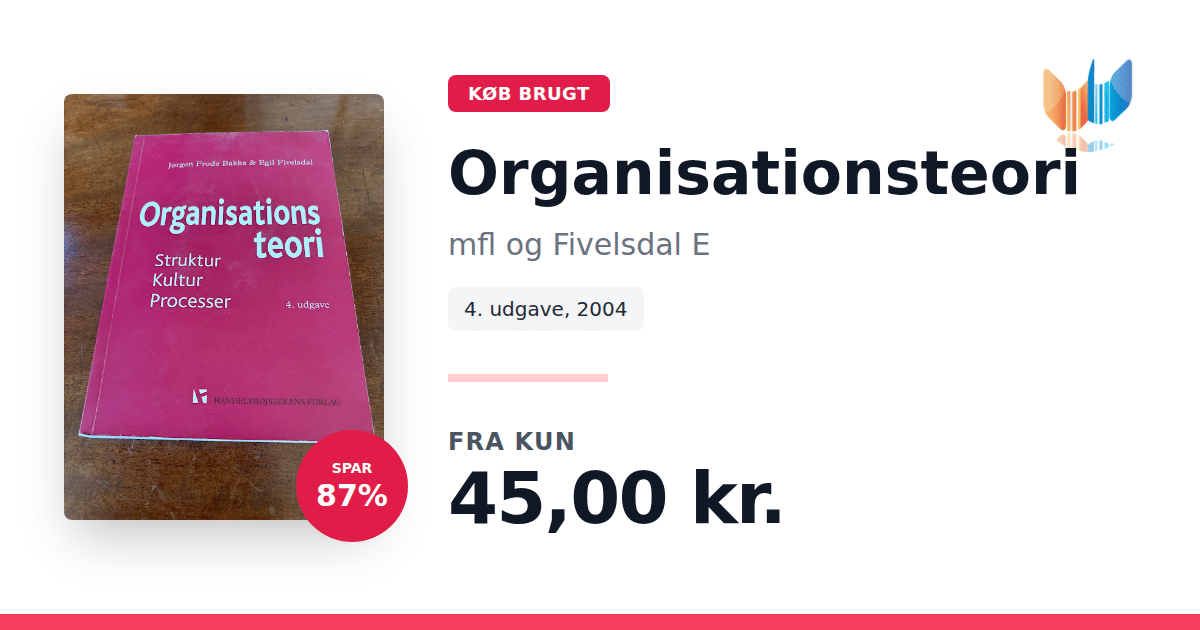 Lige nu kan du købe "Organisationsteori" af mfl og Fivelsdal E til kun 45,00 kr. Du sparer hele 87% af nyprisen! Bogen du ser her er brugt, og i perfekt stand. Vi har i øjeblikket 15 eksemplarer til salg af "Organisationsteori", så husk at se de forskellige udgaver.