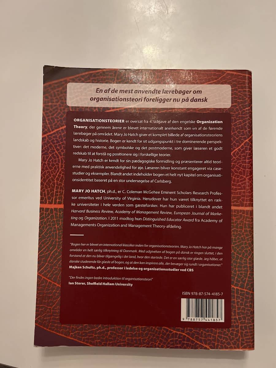 Organisationsteorier er den danske oversættelse af den banebrydende engelske Organization Theory og repræsenterer nu den fjerde udgave, der siden 2020 har imponeret med sit brede blik på organisationsteoriens udvikling og historie. Mary Jo Hatch guider læseren gennem teoriens fundament ved at fokusere på tre centrale perspektiver: det moderne, det symbolske og det postmoderne, hvilket giver et alsidigt redskab til at analysere og forstå organisatoriske dynamikker. Med sin unikke evne til at kombinere teoretisk dybde med praktisk relevans, præsenterer Hatch casestudier og illustrative eksempler, som sætter teorierne i et virkelighedsnært lys. Bogen indeholder blandt andet et nyt kapitel om organisationsidentitet, der blandt andet er formet af en omfattende undersøgelse af Carlsberg, og understreger dermed dens anvendelighed i en moderne kontekst.