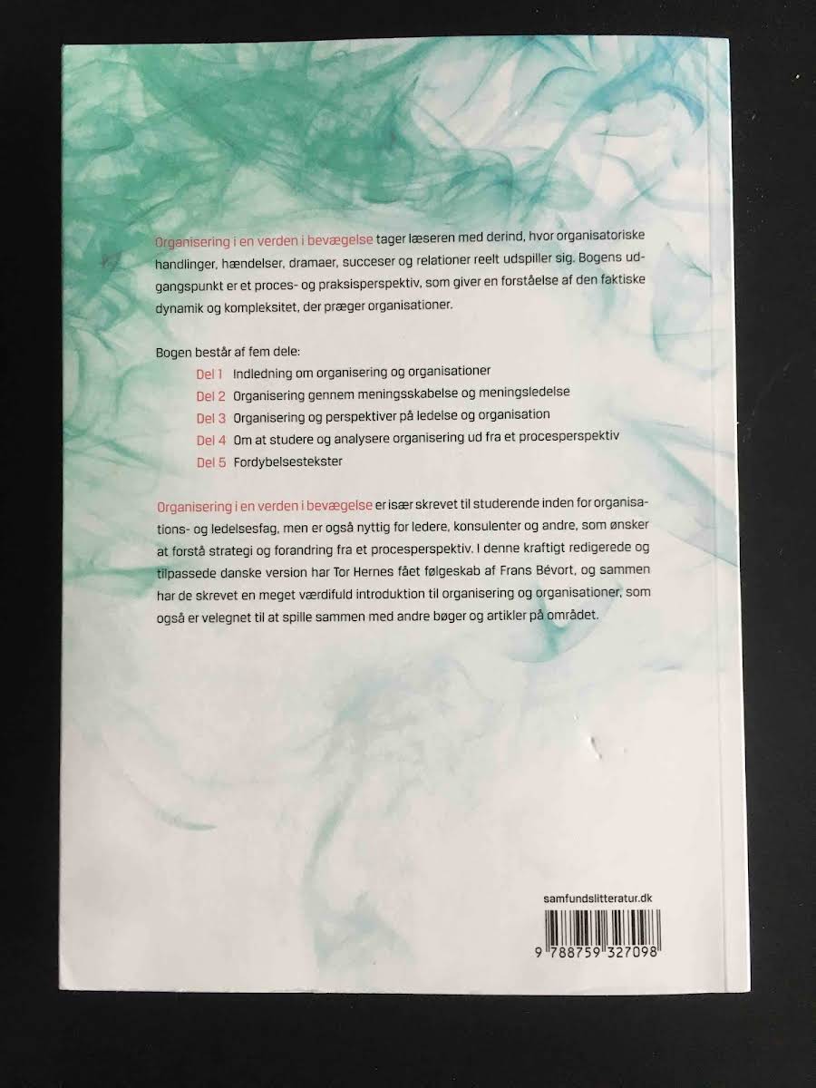Organisering i en verden i bevægelse udfolder et rigt proces- og praksispenspektiv, som giver læseren indsigt i de dynamikker, der former moderne organisationer. Med udgangspunkt i den virkelige verden, hvor handlinger, hændelser og relationer konstant er under udvikling, bliver vi præsenteret for de komplekse processer, der ligger til grund for organisatorisk forandring. Bogen er inddelt i fire centrale dele, der omhandler introduktionen til organisering og organisationer, meningsskabelse og meningsledelse, samt ledelse og organisering set fra forskellige perspektiver. Afslutningen fokuserer på metoder til at studere og analysere disse processer. Organisering i en verden i bevægelse er velegnet til studerende inden for organisations- og ledelsesfag, men tilbyder også ledere, konsulenter og andre interesserede værdifulde redskaber til at forstå og navigere i forretningsverdenens konstante bevægelse.