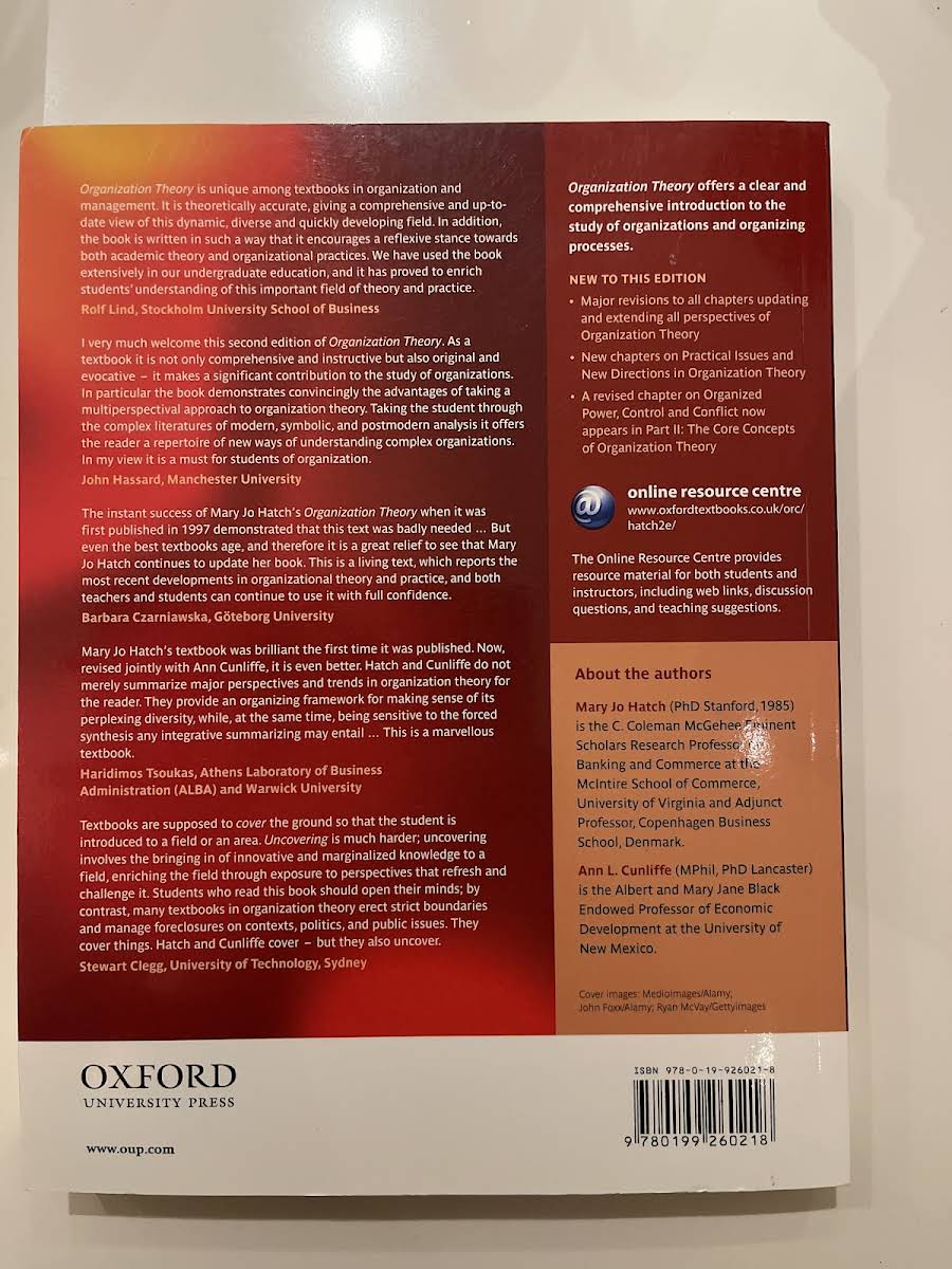 Organization Theory giver en klar og omfattende introduktion til studiet af organisationer og organiseringsprocesser. Bogen præsenterer moderne, symbolske og postmoderne perspektiver side om side og inviterer læseren til at sammenligne og reflektere over deres styrker og begrænsninger. I denne anden udgave fra 2006 kombinerer Mary Jo Hatch og Ann L. Cunliffe teori med illustrative eksempler, så komplekse begreber bliver tilgængelige for både studerende og praktikere. Med sine ca. 400 sider i paperback-format fungerer den som en grundbog til kurser i organisationsstudier og som et inspirerende opslagsværk for alle, der ønsker en nuanceret forståelse af, hvordan organisationer formes og forandres.