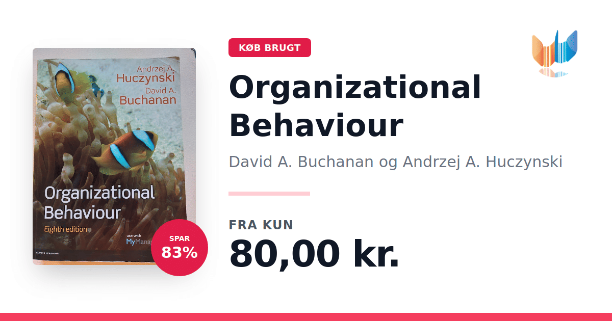 Lige nu kan du købe "Organizational Behaviour" af David A. Buchanan og Andrzej A. Huczynski til kun 80,00 kr. Du sparer hele 83% af nyprisen! Bogen du ser her er brugt, og i perfekt stand. Vi har i øjeblikket 5 eksemplarer til salg af "Organizational Behaviour", så husk at se de forskellige udgaver.
