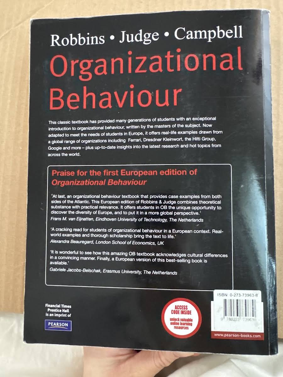 Organizational Behaviour af Stephen P. Robbins, Timothy A. Judge og Timothy Campbell er en omfattende lærebog udgivet af Pearson Education i 2010 som første udgave. Bogen henvender sig både til bachelor- og kandidatniveau og giver en sammenhængende introduktion til teorier og praksis inden for organisationsadfærd. Med over 600 sider præsenterer teksten de nyeste forskningsresultater og tager fat på temaer som globalisering, kulturel mangfoldighed, arbejdsstyrkens sammensætning og etiske dilemmaer. Strukturen sikrer en klar kobling mellem grundlæggende begreber og eksempler fra den virkelige verden, hvilket gør stoffet direkte anvendeligt i både undervisning og praksis. Et væsentligt træk ved bogen er de nyskrevne cases, som henter inspiration fra internationale organisationer. Eksempler som Ferrari, Dresdner Kleinwort, Hilti Group og Google illustrerer, hvordan teori omsættes til handling på tværs af landegrænser og brancher.