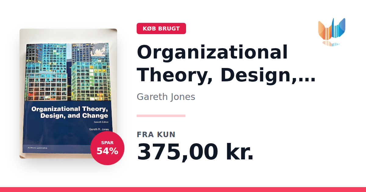 Lige nu kan du købe "Organizational Theory, Design, and Change, Global Edition" af Gareth Jones til kun 375,00 kr. Du sparer hele 54% af nyprisen! Bogen du ser her er brugt, og i god stand. Vi har i øjeblikket 4 eksemplarer til salg af "Organizational Theory, Design, and Change, Global Edition", så husk at se de forskellige udgaver.