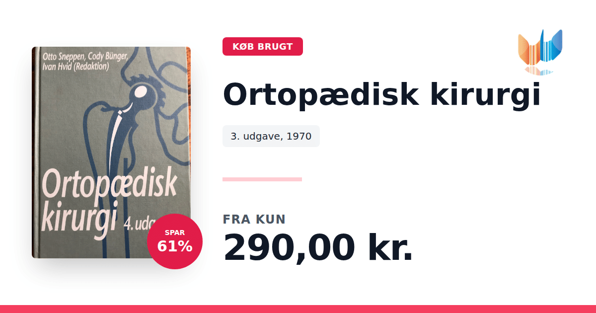 Lige nu kan du købe "Ortopædisk kirurgi" til kun 290,00 kr. Du sparer hele 61% af nyprisen! Bogen du ser her er brugt, og i perfekt stand. Vi har i øjeblikket 3 eksemplarer til salg af "Ortopædisk kirurgi", så husk at se de forskellige udgaver.