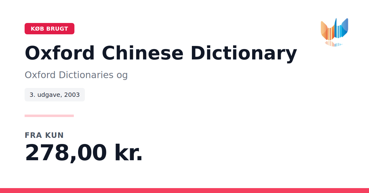Lige nu kan du købe "Oxford Chinese Dictionary" af Oxford Dictionaries og til kun 278,00 kr. Bogen du ser her er brugt, og i perfekt stand. Vi har i øjeblikket kun et enkelt eksemplar til salg af "Oxford Chinese Dictionary", så slå til mens du kan!