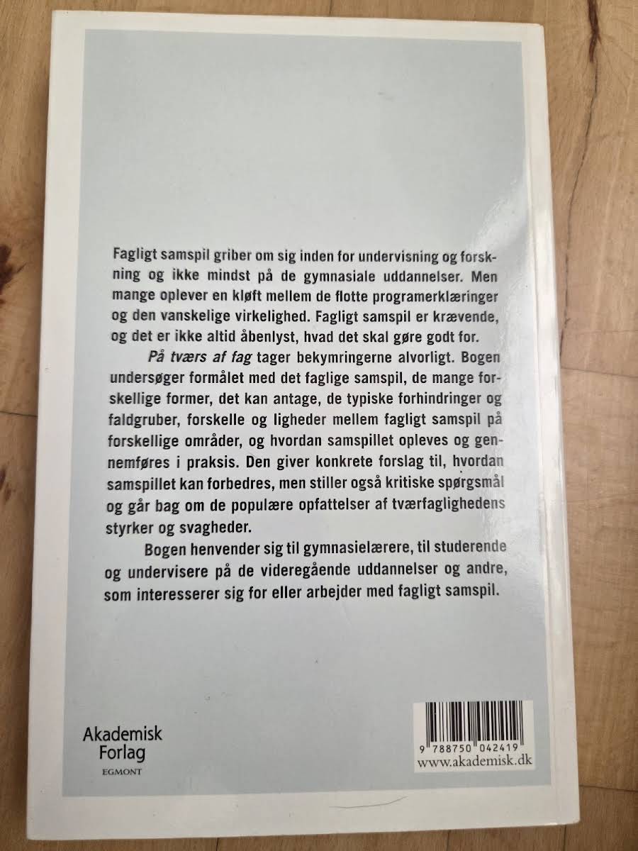 I "På tværs af fag" dykker Søren Harnow Klausen ned i dynamikkerne mellem de forskellige fagområder, som præger både erhvervslivet, forskningsverdenen og gymnasiale uddannelser. Bogen undersøger, hvordan de store programerklæringer møder den komplekse virkelighed, og hvad det kræver at få det faglige samspil til at fungere. Med udgangspunkt i en grundig analyse af de tilsyneladende modsætninger mellem ideal og praksis, belyser Klausen både de udfordringer og muligheder, der opstår, når forskellige fagligheder skal smelte sammen. "På tværs af fag" giver læseren et nuanceret indblik i, hvordan et effektivt samarbejde på tværs af discipliner bedst understøttes og videreudvikles.
