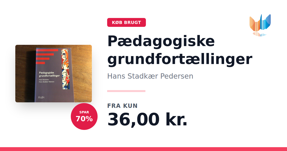 Lige nu kan du købe "Pædagogiske grundfortællinger" af Hans Stadkær Pedersen til kun 36,00 kr. Du sparer hele 70% af nyprisen! Bogen du ser her er brugt, og i perfekt stand. Vi har i øjeblikket 5 eksemplarer til salg af "Pædagogiske grundfortællinger", så husk at se de forskellige udgaver.