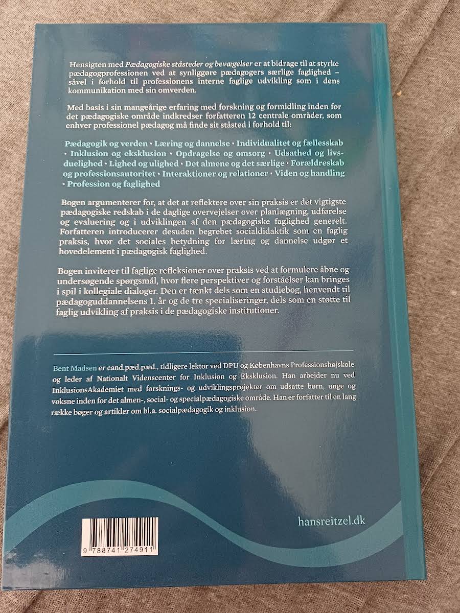 *Pædagogiske ståsteder og bevægelser - På tværs af almen-, social- og specialpædagogik* har til formål at styrke pædagogprofessionen ved at tydeliggøre og sætte ord på pædagogers unikke faglighed. Bogen afsøger de specifikke fagligheder inden for det almene, social- og specialpædagogiske felt og arbejder frem mod at formulere en fælles, almen pædagogisk grundfaglighed. Dette skal gavne både professionens interne udvikling og dens kommunikation med omverdenen. Forfatter Bent Madsen trækker på sin store forsknings- og formidlingserfaring og opstiller 12 centrale temaer, som professionelle pædagoger må tage stilling til. Disse omfatter blandt andet læring og dannelse, inklusion og eksklusion, opdragelse og omsorg, lighed og ulighed, viden og handling samt relationen mellem individualitet og fællesskab. Bogen fremhæver fælles og individuel refleksion som det absolut vigtigste redskab i det daglige arbejde med planlægning, udførelse og evaluering. Derudover introduceres begrebet socialdidaktik som en praksis, hvor det sociale aspekt udgør kernen i læring og dannelse. Værket inviterer aktivt til kollegial dialog gennem åbne, undersøgende spørgsmål, der bringer forskellige faglige perspektiver i spil. Hvert kapitel understøttes desuden af modeller og figurer, der gør det nemmere at afklare både fælles og personlige holdepunkter i det pædagogiske arbejde. Bogen er skrevet som studielitteratur til pædagoguddannelsens første år samt uddannelsens tre specialiseringer, men den fungerer i lige så høj grad som et konkret støtteredskab til faglig praksisudvikling ude i de pædagogiske institutioner. Bent Madsen er cand.pæd.pæd., tidligere lektor ved Københavns Professionshøjskole og DPU samt forhenværende leder af Nationalt Videnscenter for Inklusion og Eksklusion. Han er i dag tilknyttet InklusionsAkademiet, hvor han arbejder med udviklings- og forskningsprojekter om udsatte børn, unge og voksne, og han er forfatter til adskillige udgivelser om pædagogik og inklusion.