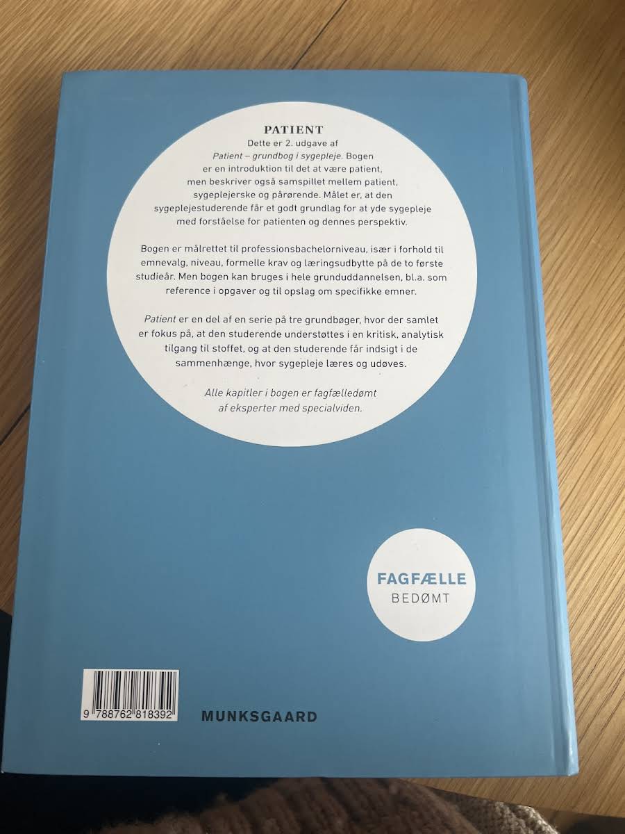 Patient – Grundbog i sygepleje, 2. udgave, introducerer læseren til den grundlæggende forståelse af patientrollen og belyser samspillet mellem patient, sygeplejerske og pårørende. Bogen har et klart fokus på at give sygeplejestuderende et solidt fundament, så de kan yde en omsorgsfuld og patientcentreret sygepleje med indsigt i patientens perspektiv. Med sit gennemarbejdede indhold er bogen specielt tilrettelagt til professionsbachelorniveau og dækker emner og krav, der er essentielle for de to første studieår. Samtidig fungerer den som et værdifuldt referenceværk gennem hele grunduddannelsen, hvor praktiske eksempler og fagfægledømte kapitler understøtter en kritisk og analytisk tilgang til sygeplejepraksis.