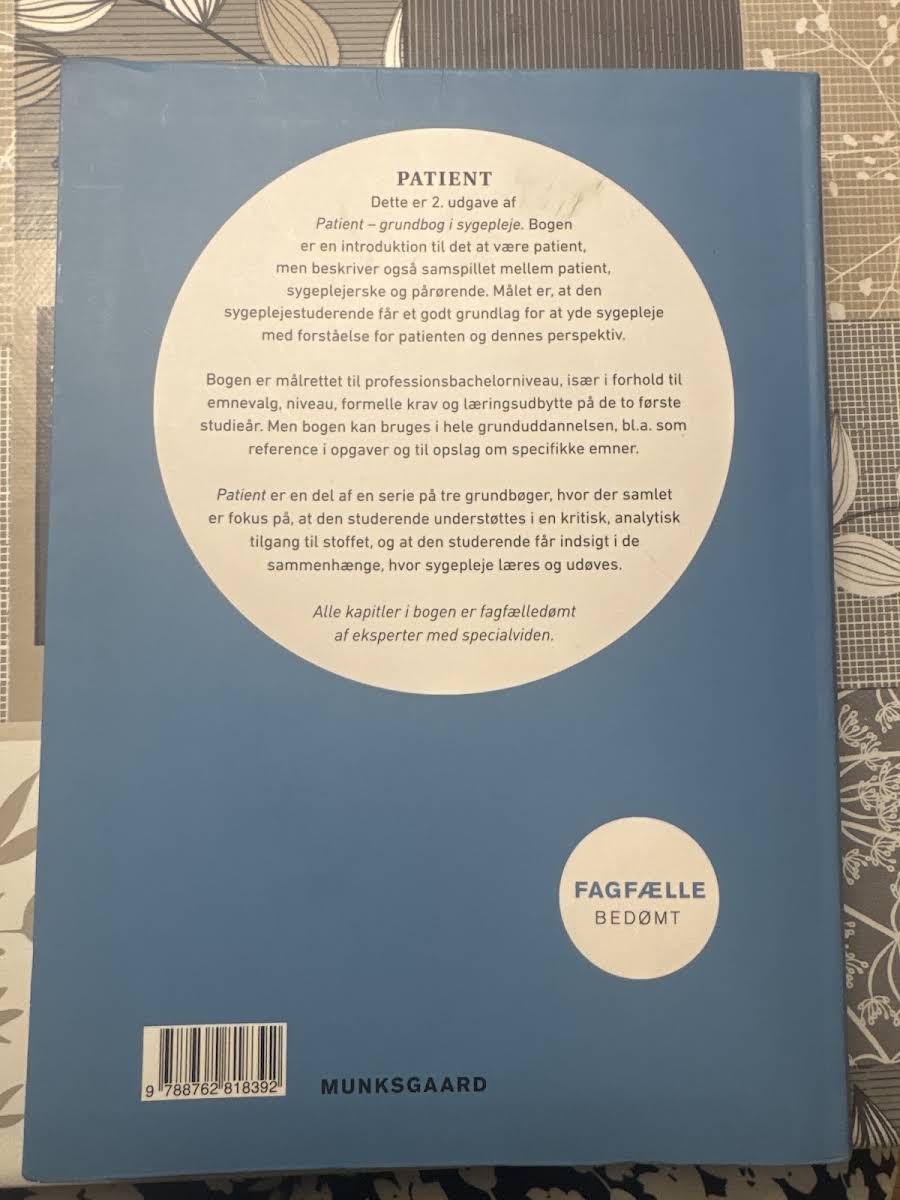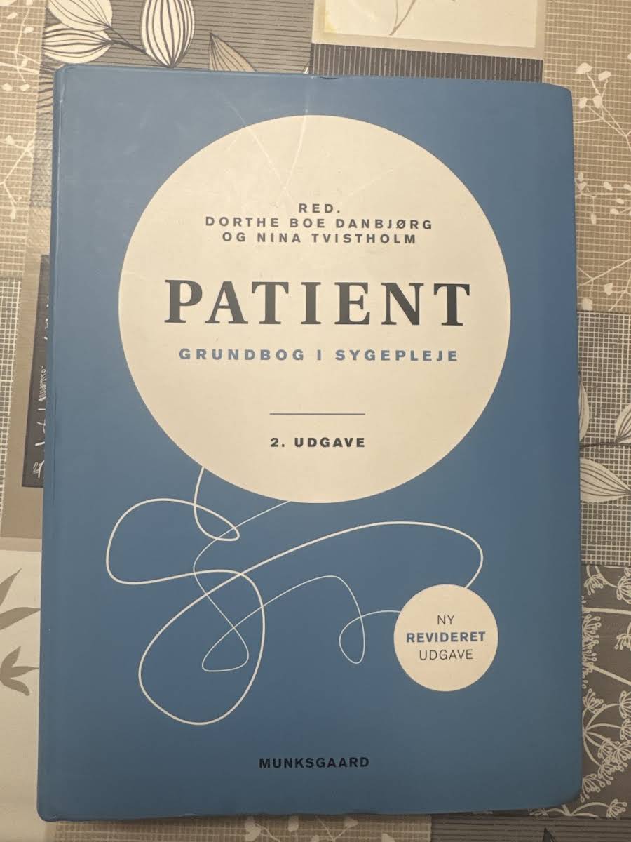 Patient – Grundbog i sygepleje, 2. udgave, introducerer læseren til den grundlæggende forståelse af patientrollen og belyser samspillet mellem patient, sygeplejerske og pårørende. Bogen har et klart fokus på at give sygeplejestuderende et solidt fundament, så de kan yde en omsorgsfuld og patientcentreret sygepleje med indsigt i patientens perspektiv. Med sit gennemarbejdede indhold er bogen specielt tilrettelagt til professionsbachelorniveau og dækker emner og krav, der er essentielle for de to første studieår. Samtidig fungerer den som et værdifuldt referenceværk gennem hele grunduddannelsen, hvor praktiske eksempler og fagfægledømte kapitler understøtter en kritisk og analytisk tilgang til sygeplejepraksis.