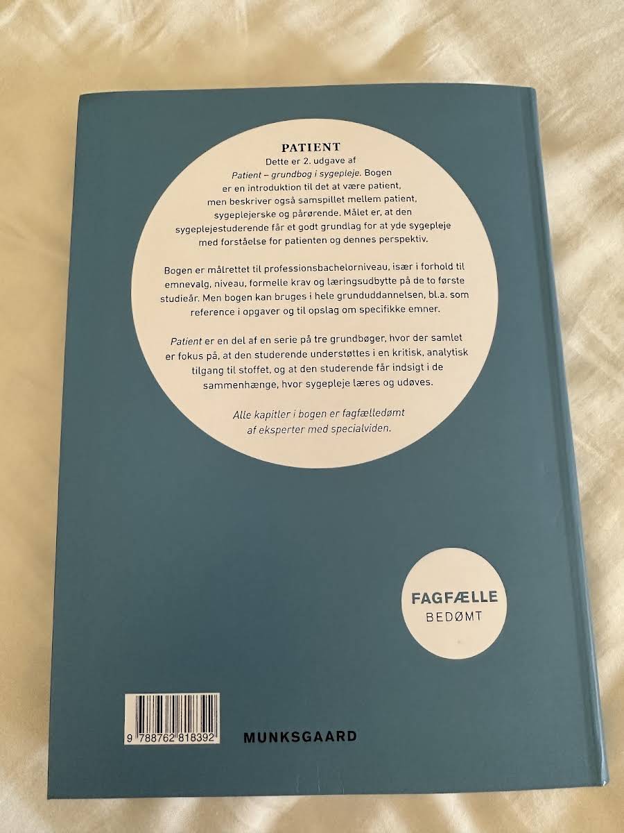 Patient – Grundbog i sygepleje, 2. udgave, introducerer læseren til den grundlæggende forståelse af patientrollen og belyser samspillet mellem patient, sygeplejerske og pårørende. Bogen har et klart fokus på at give sygeplejestuderende et solidt fundament, så de kan yde en omsorgsfuld og patientcentreret sygepleje med indsigt i patientens perspektiv. Med sit gennemarbejdede indhold er bogen specielt tilrettelagt til professionsbachelorniveau og dækker emner og krav, der er essentielle for de to første studieår. Samtidig fungerer den som et værdifuldt referenceværk gennem hele grunduddannelsen, hvor praktiske eksempler og fagfægledømte kapitler understøtter en kritisk og analytisk tilgang til sygeplejepraksis.