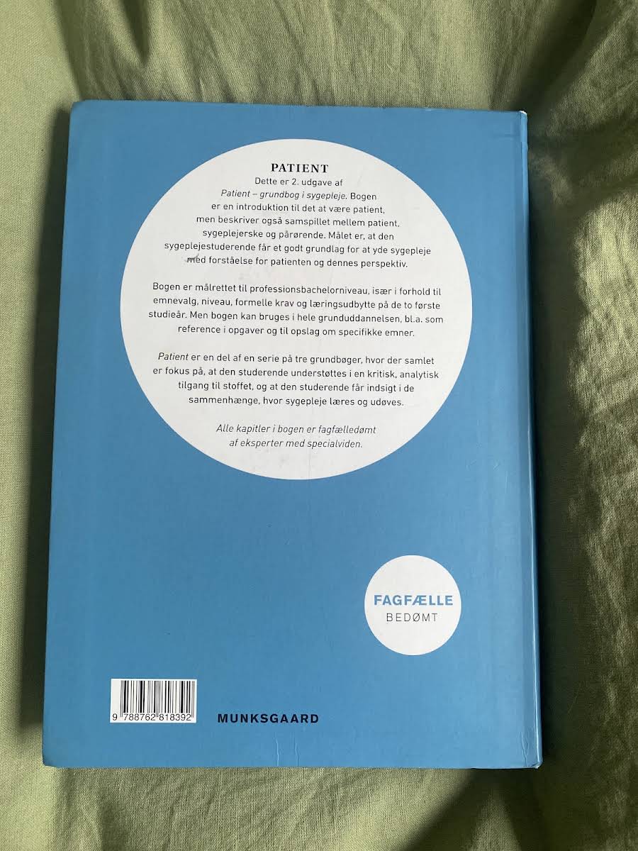 Patient – Grundbog i sygepleje, 2. udgave, introducerer læseren til den grundlæggende forståelse af patientrollen og belyser samspillet mellem patient, sygeplejerske og pårørende. Bogen har et klart fokus på at give sygeplejestuderende et solidt fundament, så de kan yde en omsorgsfuld og patientcentreret sygepleje med indsigt i patientens perspektiv. Med sit gennemarbejdede indhold er bogen specielt tilrettelagt til professionsbachelorniveau og dækker emner og krav, der er essentielle for de to første studieår. Samtidig fungerer den som et værdifuldt referenceværk gennem hele grunduddannelsen, hvor praktiske eksempler og fagfægledømte kapitler understøtter en kritisk og analytisk tilgang til sygeplejepraksis.
