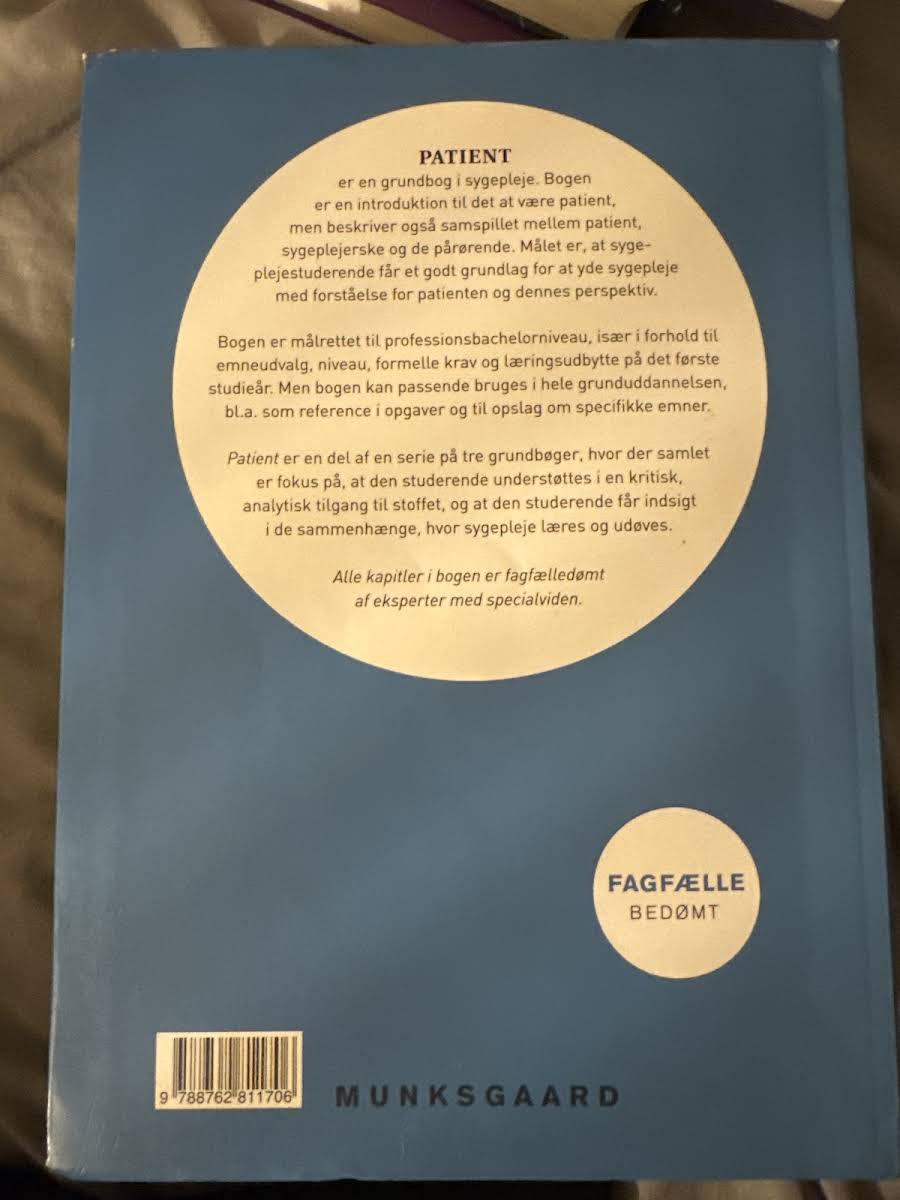 Patient er en grundbog, der giver et indgående indblik i patientrollen og det komplekse samspil mellem patient, sygeplejerske og pårørende. Bogen skaber et solidt udgangspunkt for at forstå de menneskelige aspekter i sygeplejens praksis og understøtter udviklingen af en empatisk og reflekteret tilgang til faget. Bogen henvender sig primært til professionsbachelorstuderende i deres første år, hvor den hjælper med at opbygge den nødvendige teoretiske ballast og de analytiske færdigheder, der er essentielle i sygeplejen. Samtidig fungerer den som en værdifuld reference gennem hele uddannelsen. Patient er en del af en serie på tre grundbøger, der tilsammen fremmer en kritisk tilgang til sygeplejefaget og belyser de mange facetter, der spiller ind, når sygepleje læres og udøves. Hvert kapitel er fagfælledømt af eksperter, hvilket sikrer en høj faglig kvalitet og relevans for studerende. Bogen indeholder desuden en individuel e-nøgle, som åbner op for adgang til en i-bogsversion med videoer, quizzer og andet ekstramateriale – et redskab, der yderligere understøtter læringsprocessen og den faglige fordybelse.