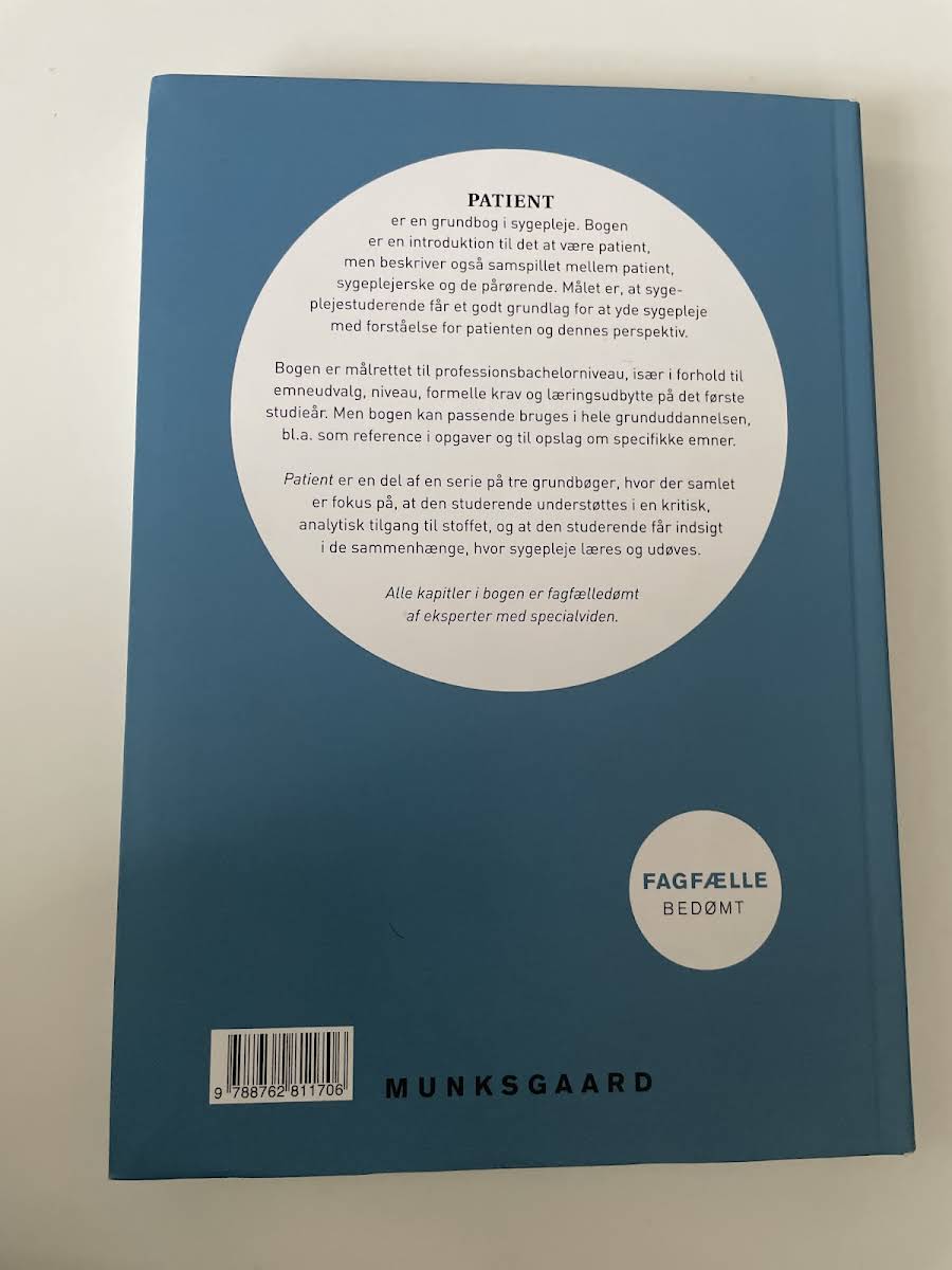 Patient er en grundbog, der giver et indgående indblik i patientrollen og det komplekse samspil mellem patient, sygeplejerske og pårørende. Bogen skaber et solidt udgangspunkt for at forstå de menneskelige aspekter i sygeplejens praksis og understøtter udviklingen af en empatisk og reflekteret tilgang til faget. Bogen henvender sig primært til professionsbachelorstuderende i deres første år, hvor den hjælper med at opbygge den nødvendige teoretiske ballast og de analytiske færdigheder, der er essentielle i sygeplejen. Samtidig fungerer den som en værdifuld reference gennem hele uddannelsen. Patient er en del af en serie på tre grundbøger, der tilsammen fremmer en kritisk tilgang til sygeplejefaget og belyser de mange facetter, der spiller ind, når sygepleje læres og udøves. Hvert kapitel er fagfælledømt af eksperter, hvilket sikrer en høj faglig kvalitet og relevans for studerende. Bogen indeholder desuden en individuel e-nøgle, som åbner op for adgang til en i-bogsversion med videoer, quizzer og andet ekstramateriale – et redskab, der yderligere understøtter læringsprocessen og den faglige fordybelse.