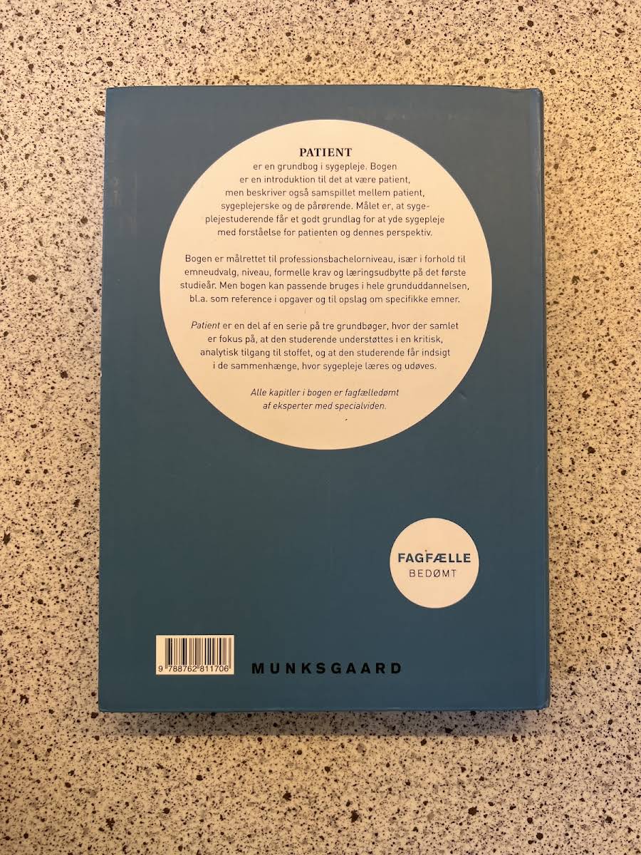 Patient er en grundbog, der giver et indgående indblik i patientrollen og det komplekse samspil mellem patient, sygeplejerske og pårørende. Bogen skaber et solidt udgangspunkt for at forstå de menneskelige aspekter i sygeplejens praksis og understøtter udviklingen af en empatisk og reflekteret tilgang til faget. Bogen henvender sig primært til professionsbachelorstuderende i deres første år, hvor den hjælper med at opbygge den nødvendige teoretiske ballast og de analytiske færdigheder, der er essentielle i sygeplejen. Samtidig fungerer den som en værdifuld reference gennem hele uddannelsen. Patient er en del af en serie på tre grundbøger, der tilsammen fremmer en kritisk tilgang til sygeplejefaget og belyser de mange facetter, der spiller ind, når sygepleje læres og udøves. Hvert kapitel er fagfælledømt af eksperter, hvilket sikrer en høj faglig kvalitet og relevans for studerende. Bogen indeholder desuden en individuel e-nøgle, som åbner op for adgang til en i-bogsversion med videoer, quizzer og andet ekstramateriale – et redskab, der yderligere understøtter læringsprocessen og den faglige fordybelse.