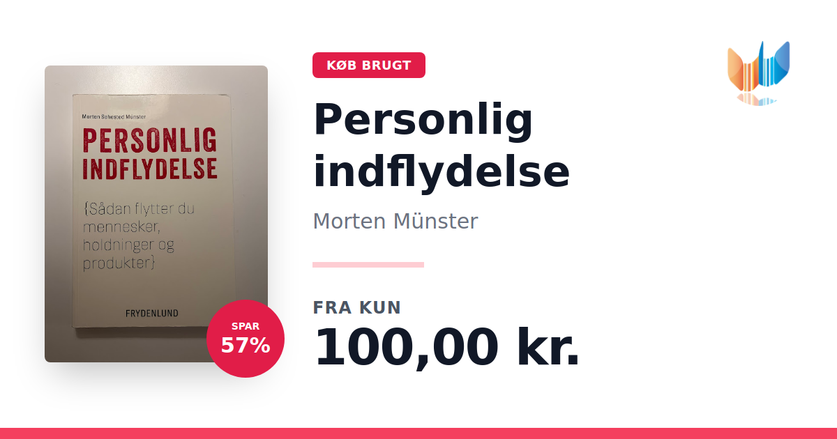 Lige nu kan du købe "Personlig indflydelse" af Morten Münster til kun 100,00 kr. Du sparer hele 57% af nyprisen! Bogen du ser her er brugt, og i god stand. Vi har i øjeblikket kun et enkelt eksemplar til salg af "Personlig indflydelse", så slå til mens du kan!
