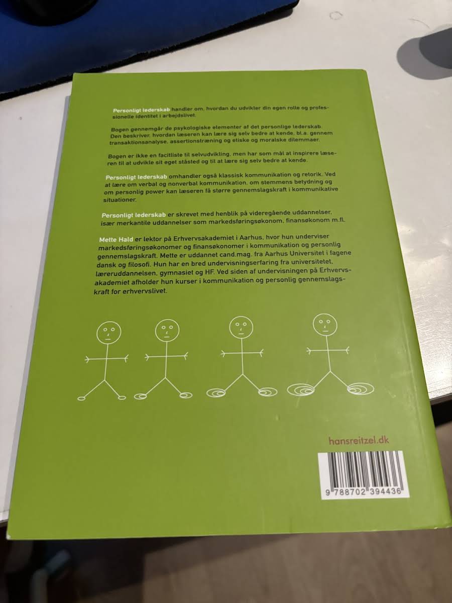 Hvordan kan du styrke din egen rolle og professionelle identitet i arbejdslivet? I denne 2. udgave af Personligt lederskab får du en gennemgribende præsentation af de psykologiske komponenter, der former din personlige lederskabsstil. Du introduceres til redskaber som transaktionsanalyse og assertionstræning og udfordres gennem etiske og moralske dilemmaer, der sætter dine værdier og valg under lup. Bogen er særligt målrettet videregående uddannelser inden for det merkantile felt - fx markedsføringsøkonom, finansøkonom og beslægtede studieretninger. Med konkrete eksempler og reflektionsøvelser giver teksten dig fagligt funderede metoder til at arbejde bevidst med din kommunikation og gennemslagskraft. Forfatter Mette Hald er lektor på Erhvervsakademiet i Aarhus, hvor hun underviser markedsføringsøkonomer og finansøkonomer i kommunikation og personlig gennemslagskraft. Hun er cand.mag. i dansk og filosofi fra Aarhus Universitet og besidder omfattende erfaring fra universitetet, læreruddannelsen, gymnasiet og HF.