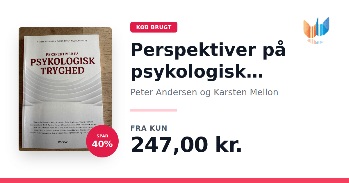 Lige nu kan du købe "Perspektiver på psykologisk tryghed" af Peter Andersen og Karsten Mellon til kun 247,00 kr. Du sparer hele 34% af nyprisen! Bogen du ser her er brugt, og i perfekt stand. Vi har i øjeblikket kun et enkelt eksemplar til salg af "Perspektiver på psykologisk tryghed", så slå til mens du kan!