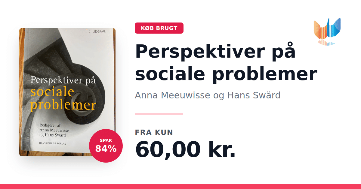 Lige nu kan du købe "Perspektiver på sociale problemer" af Anna Meeuwisse og Hans Swärd til kun 60,00 kr. Du sparer hele 84% af nyprisen! Bogen du ser her er brugt, og i perfekt stand. Vi har i øjeblikket 3 eksemplarer til salg af "Perspektiver på sociale problemer", så husk at se de forskellige udgaver.