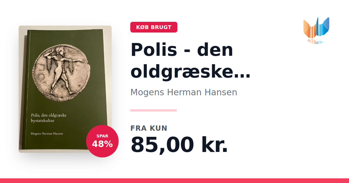 Lige nu kan du købe "Polis - den oldgræske bystatskultur" af Mogens Herman Hansen til kun 85,00 kr. Du sparer hele 48% af nyprisen! Bogen du ser her er brugt, og i perfekt stand. Vi har i øjeblikket kun et enkelt eksemplar til salg af "Polis - den oldgræske bystatskultur", så slå til mens du kan!