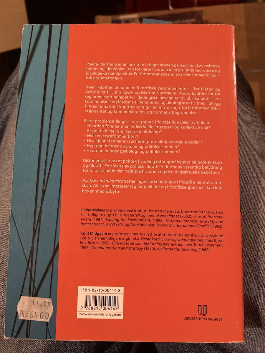 "Politisk tenkning" præsenterer et solidt indblik i de politiske ideer, der har formet samfundsdebatten gennem historien. Bogen, udgivet i 2003 af Raino Malnes og Knut Midgaard, tilbyder en grundig gennemgang af centrale politiske teorier og tankestrømninger, som har haft afgørende indflydelse på både fortid og nutid. Med 392 sider byder denne paperback på en rammende oversigt over politiske ideer fra prominente tænkere som Platon, Aristoteles, Cicero, Augustin, Thomas Aquinas, Machiavelli, Hobbes, Locke, Rousseau, Montesquieu, David Hume, Adam Smith, Kant, Edmund Burke, Hegel, Alexis de Tocqueville, John Stuart Mill, Marx, Engels, Bernstein, Lenin og John Rawls. Bogen er et uundværligt redskab for alle, der ønsker at udforske og forstå udviklingen af politisk tænkning gennem tiderne.