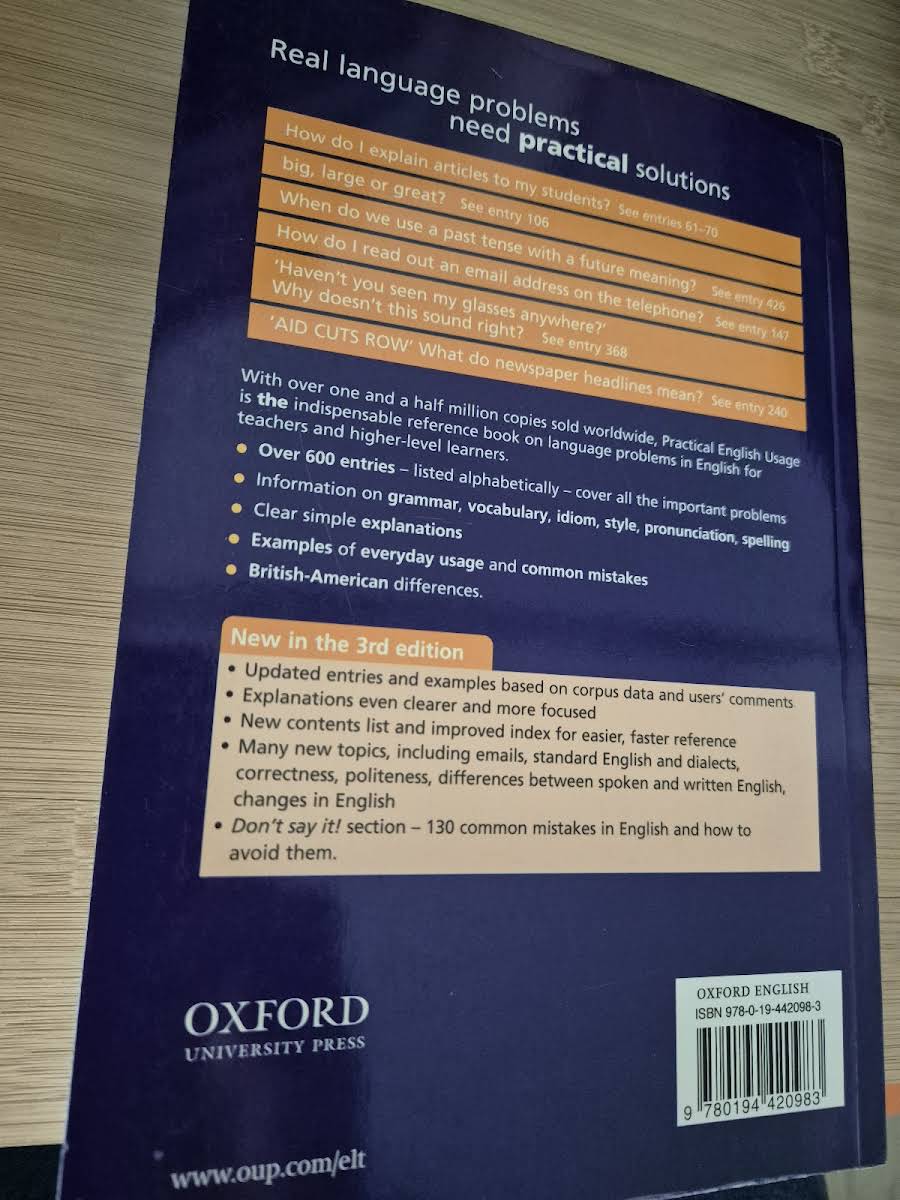 Practical English Usage er Michael Swans anerkendte opslagsværk i tredie udgave, udgivet i 2005 af Oxford University Press. Denne paperbackudgave på 688 sider fungerer som et uundværligt redskab for både elever og undervisere, der søger præcise svar på daglige sproglige udfordringer. Bogen indeholder over 600 korte, autoritative opslag, der først og fremmest behandler grammatiske problemstillinger. Hertil kommer fyldige afsnit om ordforråd, faste vendinger, stil, udtale og stavning - alle illustreret med klare eksempler baseret på moderne korpusforskning. Derudover rummer værket et omfattende kapitel om engelsk sprogvariation: standardengelsk kontra dialekter, aspekter af korrekthed, forskelle mellem talt og skrevet engelsk samt niveauer af formel og uformel stil. Praktisk, veldokumenteret og let at navigere.