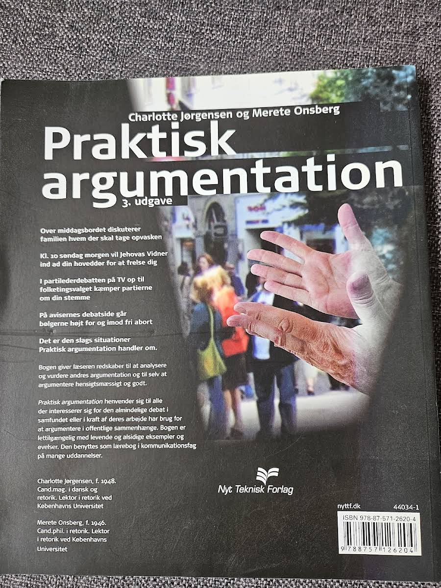 Praktisk Argumentation præsenterer en række værktøjer, der hjælper læseren til både at vurdere og formulere argumenter i hverdagens mange debatter. Med eksempler hentet fra alt fra middagsbordet til de store politiske diskussioner giver bogen et indblik i, hvordan man med velovervejede argumenter kan gøre sin stemme hørt. Bogen retter sig mod alle, der ønsker at forstå samfundets meningsudvekslinger eller har brug for at argumentere effektivt i offentlige sammenhænge. Med et klart sprog og levende øvelser illustreres principperne bag god kommunikation på en tilgængelig måde, hvilket gør Praktisk Argumentation velegnet både som selvstudie og som støttemateriale i undervisningen. I dette 144-siders værk fra 2008 kombineres teoretisk viden med praktiske redskaber, der sammen bidrager til en bedre forståelse af, hvordan vi kan engagere os i debat og kritisk tænkning. Praktisk Argumentation giver altså både den enkelte og den professionelle debatører et solidt fundament for at navigere sikkert i dagligdagens argumenter.