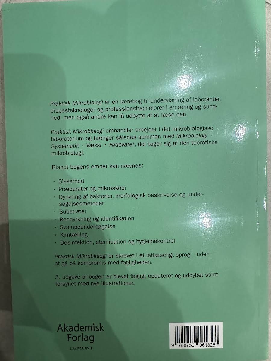 Praktisk Mikrobiologi er en grundlæggende lærebog, der henvender sig til laboranter, procesteknologer samt professionsbachelorer inden for ernæring og sundhed, men den vil også være til gavn for andre med interesse for mikrobiologi. Bogen dykker ned i det daglige arbejde i det mikrobiologiske laboratorium og fungerer som en naturlig forlængelse af den teoretiske mikrobiologi, herunder systematik, vækst og fødevaremikrobiologi. Blandt bogens emner findes: • Sikkerhed • Præparater og mikroskopi • Dyrkning af bakterier, morfologisk beskrivelse og undersøgelsesmetoder • Substrater • Rendyrkning og identifikation • Svampeundersøgelse • Desinfektion, sterilisation og hygiejnekontrol Denne 3. udgave, udgivet af Akademisk Forlag i 2022, er fagligt opdateret og uddybet, og den indeholder nye illustrationer, der gør stoffet let tilgængeligt uden at gå på kompromis med den faglige dybde.