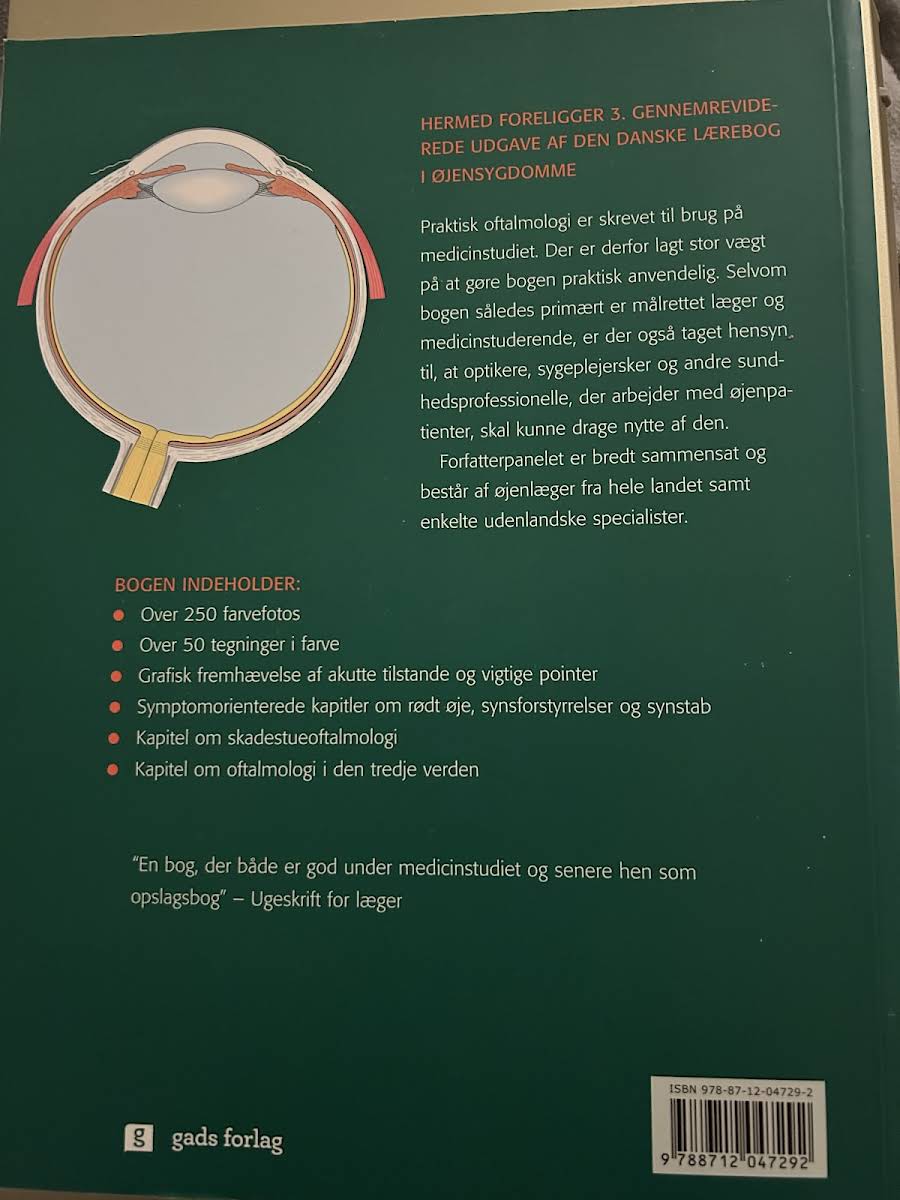 Praktisk oftalmologi er den uundværlige lærebog for alle, der vil mestre øjensygdomme - lige fra medicinstuderende til praktiserende læger. Bogen kombinerer pensumdækning og pædagogisk opbygning med et skarpt fokus på klinisk anvendelighed, så du har det nødvendige redskab fra studiestart til hospitalsgang. Selvom målgruppen primært er læger og medicinstuderende, er teksten også tilrettelagt, så optikere, sygeplejersker og andre fagpersoner kan drage nytte af de klare gennemgange og illustrationsrige afsnit om patientundersøgelse og behandling. I 3. udgave fra 2013 er materialet fortsat struktureret i tre overordnede dele. Første del præsenterer de basale discipliner: anatomi og fysiologi, øjets optik, farmakologi samt anamnese og klinisk undersøgelse. Anden del fører læseren grundigt gennem de enkelte øjensygdomme og tværgående emner som neuro-oftalmologi, børneoftalmologi og socialoftalmologi - alt sammen i særskilte kapitler, der sikrer en systematisk tilgang. Tredje del er symptom- og problemorienteret og behandler kliniske scenarier som akut rødt øje, synsforstyrrelser, synstab og øjenskader. Vigtige pointer er fremhævet i røde bokse, mens uddybende baggrundsviden og illustrative patienthistorier er samlet i grønne bokse.