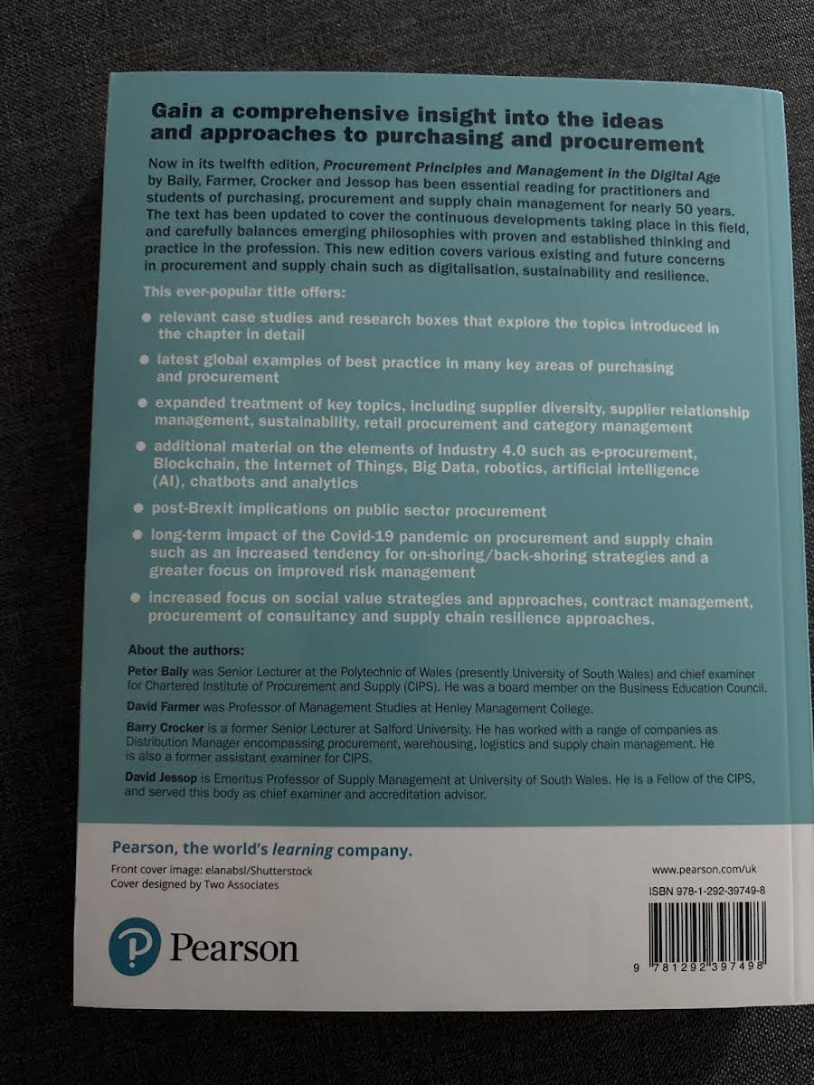 Procurement Principles and Management in the Digital Age provides a thorough exploration of current strategies and evolving practices in purchasing, procurement, and supply chain management. Now in its 2nd edition, this trusted work by Peter Baily, David Farmer, Barry Crocker, and David Jessop offers a balanced perspective that weaves together established methodologies with progressive ideas emerging in the digital era. The book delves into digitalisation trends, sustainability, and resilience within the procurement and supply chain sectors. It features relevant case studies and detailed research boxes that illuminate key topics. Readers will encounter the latest global examples of best practices, alongside expanded discussions on supplier diversity, supplier relationship management, retail procurement, and category management. Further, the text addresses important contemporary challenges by incorporating discussions on Industry 4.0 elements such as e-procurement, Blockchain, the Internet of Things, Big Data, robotics, artificial intelligence, chatbots, and analytics. With additional insights into post-Brexit public sector procurement, the long-term effects of the Covid-19 pandemic, as well as social value strategies and contract management approaches, this edition serves as an up-to-date resource for both practitioners and students alike.