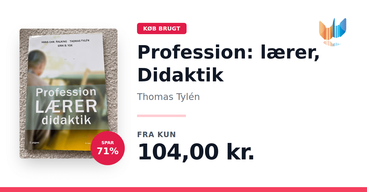 Lige nu kan du købe "Profession: lærer, Didaktik" af Thomas Tylén til kun 104,00 kr. Du sparer hele 71% af nyprisen! Bogen du ser her er brugt, og i god stand. Vi har i øjeblikket kun et enkelt eksemplar til salg af "Profession: lærer, Didaktik", så slå til mens du kan!
