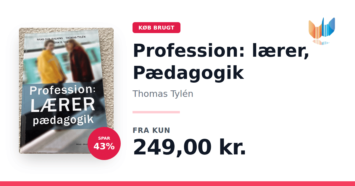 Lige nu kan du købe "Profession: lærer, Pædagogik" af Thomas Tylén til kun 249,00 kr. Du sparer hele 43% af nyprisen! Bogen du ser her er brugt, og i perfekt stand. Vi har i øjeblikket 2 eksemplarer til salg af "Profession: lærer, Pædagogik", så husk at se de forskellige udgaver.