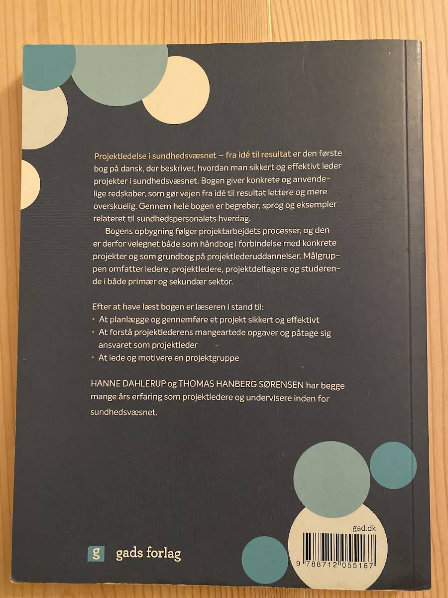 Projektledelse i sundhedsvæsnet: fra idé til resultat er en praktisk håndbog for sundhedspersoner, der skal i gang med et projekt. Bogen guider læseren gennem de forskellige faser, og præsenterer en række redskaber, der sikrer, at projektet når sit mål. Gennem en kombination af systematisk planlægning og fleksible løsninger tilbyder bogen et alsidigt værktøjssæt, der nemt kan tilpasses både større og mindre projekter. Håndbogen giver indsigt og inspiration til, hvordan idéer konkret omsættes til resultater i sundhedsvæsnet.