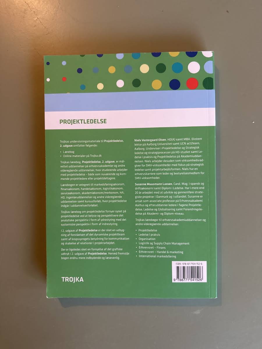 Trojkas lærebog, Projektledelse, i 2. udgave af Susanne Muusmann Lassen og Niels Vestergaard Olsen giver en moderne fortolkning af projektledelse, hvor det analytiske perspektiv om ydrestyring kombineres med det systemiske blik på indrestyring. Bogen er nøje tilpasset de relevante fagbeskrivelser for Akademiuddannelsen i Ledelse, Akademiuddannelsen i Innovation, Produkt og Produktion samt HD 1. del, og byder på et solidt fundament for studerende og praktikere, der ønsker en dybdegående forståelse af nutidens projektledelsesudfordringer. I denne fornyede udgave er der sat ekstra fokus på det dynamiske projektteam og vigtigheden af kropssprog i kommunikationen, hvilket understøtter opbygningen af effektive relationer i projektarbejdet. Projektledelse henvender sig både til den nye projektleder, der søger en grundlæggende introduktion, og til den erfarne leder, der ønsker at udvide sin projektforståelse. Med et opdateret grafisk udtryk fremstår bogen endnu mere indbydende og læsevenlig, hvilket gør den til et uvurderligt redskab inden for både ledelses- og organisationsområdet.