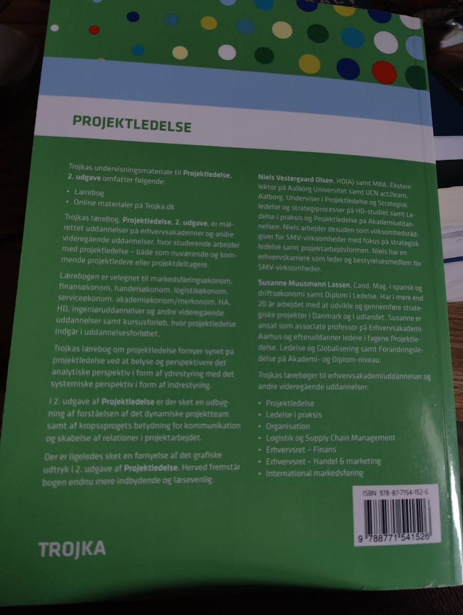 Trojkas lærebog, Projektledelse, i 2. udgave af Susanne Muusmann Lassen og Niels Vestergaard Olsen giver en moderne fortolkning af projektledelse, hvor det analytiske perspektiv om ydrestyring kombineres med det systemiske blik på indrestyring. Bogen er nøje tilpasset de relevante fagbeskrivelser for Akademiuddannelsen i Ledelse, Akademiuddannelsen i Innovation, Produkt og Produktion samt HD 1. del, og byder på et solidt fundament for studerende og praktikere, der ønsker en dybdegående forståelse af nutidens projektledelsesudfordringer. I denne fornyede udgave er der sat ekstra fokus på det dynamiske projektteam og vigtigheden af kropssprog i kommunikationen, hvilket understøtter opbygningen af effektive relationer i projektarbejdet. Projektledelse henvender sig både til den nye projektleder, der søger en grundlæggende introduktion, og til den erfarne leder, der ønsker at udvide sin projektforståelse. Med et opdateret grafisk udtryk fremstår bogen endnu mere indbydende og læsevenlig, hvilket gør den til et uvurderligt redskab inden for både ledelses- og organisationsområdet.