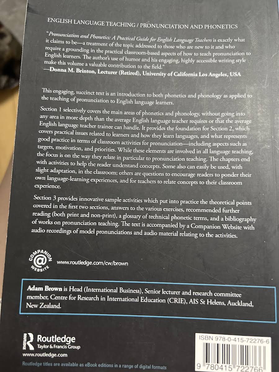 Pronunciation and Phonetics: A Practical Guide for English Language Teachers af Adam Brown er en kortfattet og målrettet introduktion til fonetik og fonologi med særligt fokus på udtaleundervisning for engelsklærere. Bogen giver en overskuelig gennemgang af de vigtigste områder, uden at fordybe sig i tunge tekniske detaljer, så både erfarne lærere og lærerstuderende kan følge med. I første del præsenteres grundlæggende begreber og principper inden for fonetik og fonologi, mens anden del sætter fokus på lærernes konkrete arbejdsfelt. Her behandles elevernes sprogtilegnelse, valget af undervisningsmål, motivationsfaktorer og prioriteringer i klassen. Hvert kapitel afsluttes med praktiske øvelser, der støtter forståelsen af de præsenterede teorier. Tredje del byder på et udvalg af illustrative undervisningsaktiviteter, som omsætter teori til praksis, samt facitliste til øvelser, anbefalet videre læsning, et fagligt ordregister og en omfattende bibliografi om udtaleundervisning. Bogen ledsages af en online ressourceplatform med lydfiler af modeludtaler og tilhørende aktivitetsmaterialer.