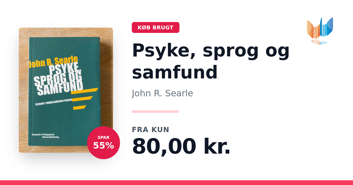 Lige nu kan du købe "Psyke, sprog og samfund" af John R. Searle til kun 80,00 kr. Du sparer hele 55% af nyprisen! Bogen du ser her er brugt, og i god stand. Vi har i øjeblikket kun et enkelt eksemplar til salg af "Psyke, sprog og samfund", så slå til mens du kan!