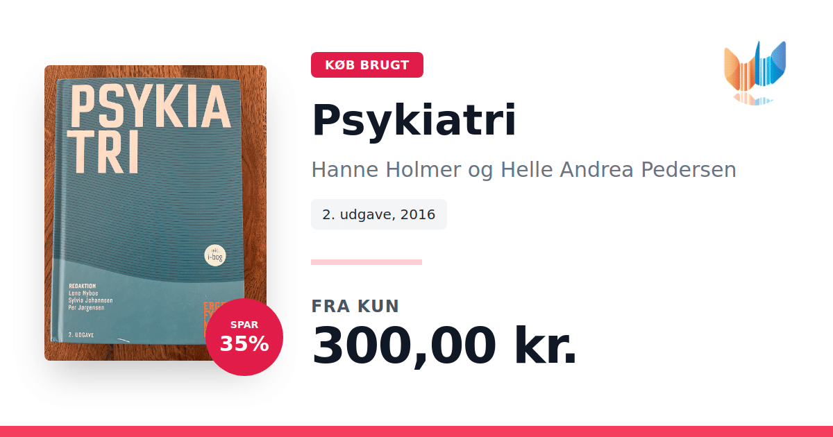 Lige nu kan du købe "Psykiatri" af Hanne Holmer og Helle Andrea Pedersen til kun 300,00 kr. Du sparer hele 35% af nyprisen! Bogen du ser her er brugt, og i perfekt stand. Vi har i øjeblikket 4 eksemplarer til salg af "Psykiatri", så husk at se de forskellige udgaver.