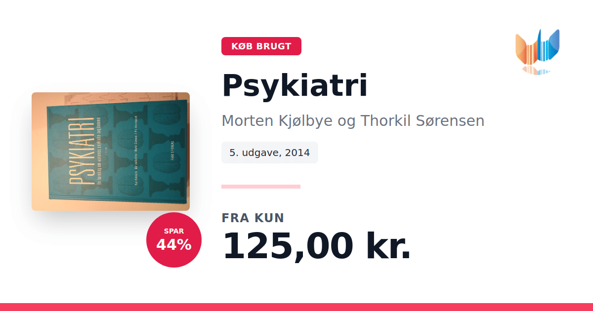 Lige nu kan du købe "Psykiatri" af Morten Kjølbye og Thorkil Sørensen til kun 125,00 kr. Du sparer hele 44% af nyprisen! Bogen du ser her er brugt, og i perfekt stand. Vi har i øjeblikket 5 eksemplarer til salg af "Psykiatri", så husk at se de forskellige udgaver.