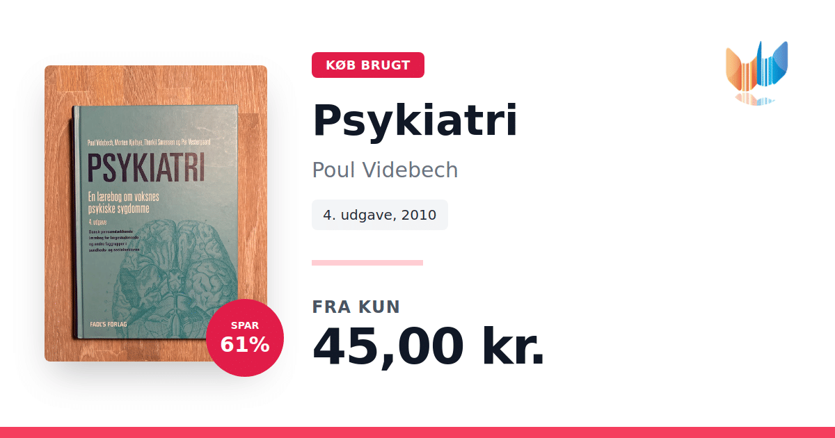Lige nu kan du købe "Psykiatri" af Poul Videbech til kun 45,00 kr. Du sparer hele 61% af nyprisen! Bogen du ser her er brugt, og i god stand. Vi har i øjeblikket kun et enkelt eksemplar til salg af "Psykiatri", så slå til mens du kan!
