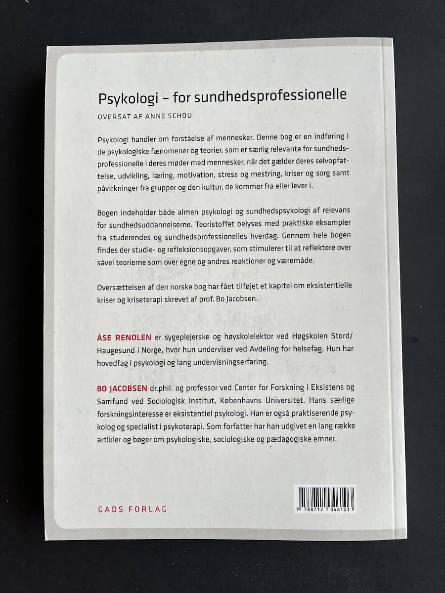 Psykologi – for sundhedsprofessionelle er en grundlæggende indføring i de psykologiske teorier og fænomener, der er centrale for arbejdet inden for sundhedssektoren. Bogen, skrevet af Åse Renolen og udgivet af Gad i 2011, behandler emner som selvopfattelse, motivation, stress, krisesituationer og sorg. Derudover lægges der vægt på de kulturelle faktorer og gruppedynamikker, der påvirker både patienters og sundhedsprofessionelles hverdag. Med en kombination af teoretisk stof og praktiske eksempler, tilbyder bogen et nyttigt perspektiv for både studerende og erfarne sundhedsprofessionelle. Den inspirerer til refleksion over, hvordan psykologiske processer former menneskers reaktioner og interaktioner, og giver dermed en dybere forståelse for de udfordringer, man møder i dagligdagen.